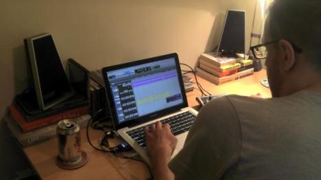 A photo to prove that you don’t need a fancy studio to make great radio. This is engineer Ali, sat in my dining room, using ProTools on his laptop, plugged into my non-specialist-audio speakers.